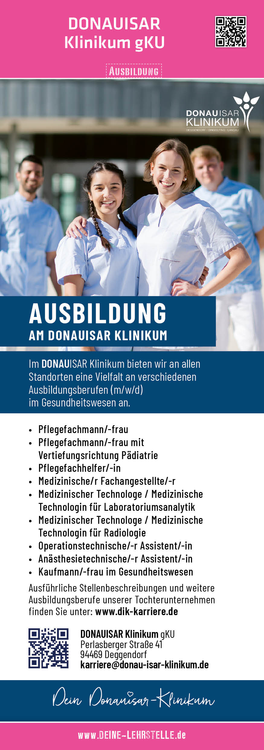 Als Akademisches Lehrkrankenhaus der MHH Hannover hat sich das DONAUISAR Klinikum verpflichtet seine Patienten nach den aktuellen klinisch-wissenschaftlichen Erkenntnissen interdisziplinär zu versorgen. Unser Klinikum verfügt über eine eigene Berufsfachschulen für Krankenpflege, Krankenpflegehilfe sowie für Physiotherapie. Mit der technischen Hochschule Deggendorf verbindet uns zudem eine enge Kooperation über den ausbildungsintegrierenden Bachelorstudiengang „Angewandte Gesundheitswissenschaften/Physiotherapie dual“ mit dem akademischen Abschluss „Bachelor of Science”.