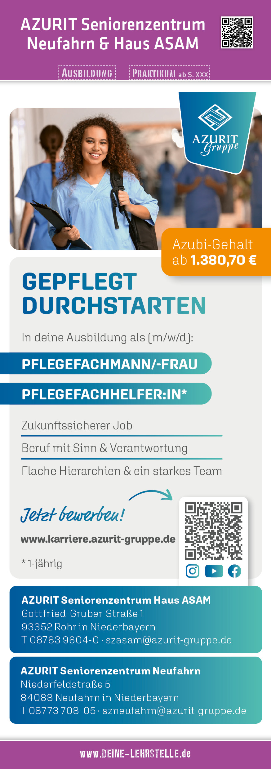 Du gehst für die Ausbildung in eine Pflegeschule. Dort hast du Unterricht. Und du arbeitest für die Ausbildung in deiner Ausbildungs-Einrichtung. Zum Beispiel in einem AZURIT Senioren-Zentrum. Im zweiten Ausbildungsjahr arbeitest du dann woanders. Zum Beispiel im Krankenhaus. Oder auf einer Kinder-Station. So lernst du noch mehr. Im dritten Jahr kommst du wieder zurück ins Senioren-Zentrum. Die meiste Zeit deiner Ausbildung bist du bei uns im Senioren-Zentrum.