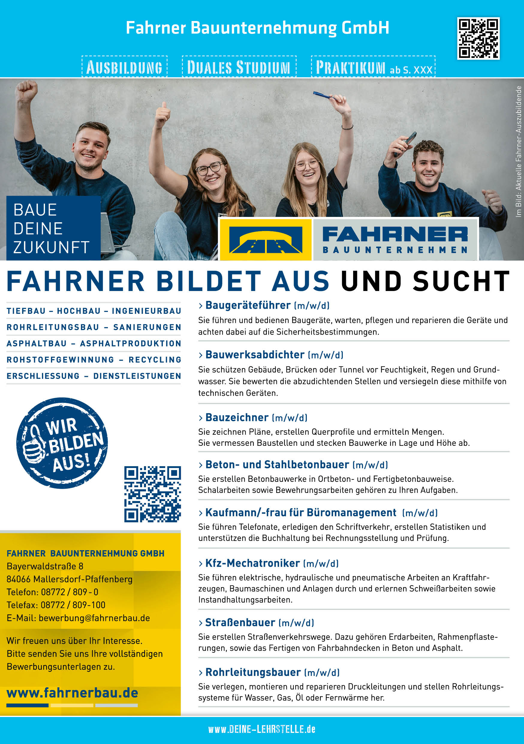 Du suchst einen Arbeitgeber, mit dem Du den Weg für Deine berufliche Zukunft bauen kannst? Als familiengeführter Betrieb setzen wir bei der Fahrner Bauunternehmung GmbH mit unseren 400 Mitarbeitern vielfältige spannende Projekte im Tiefbau, Asphaltbau, Ingenieurbau und weiteren Bereichen um.