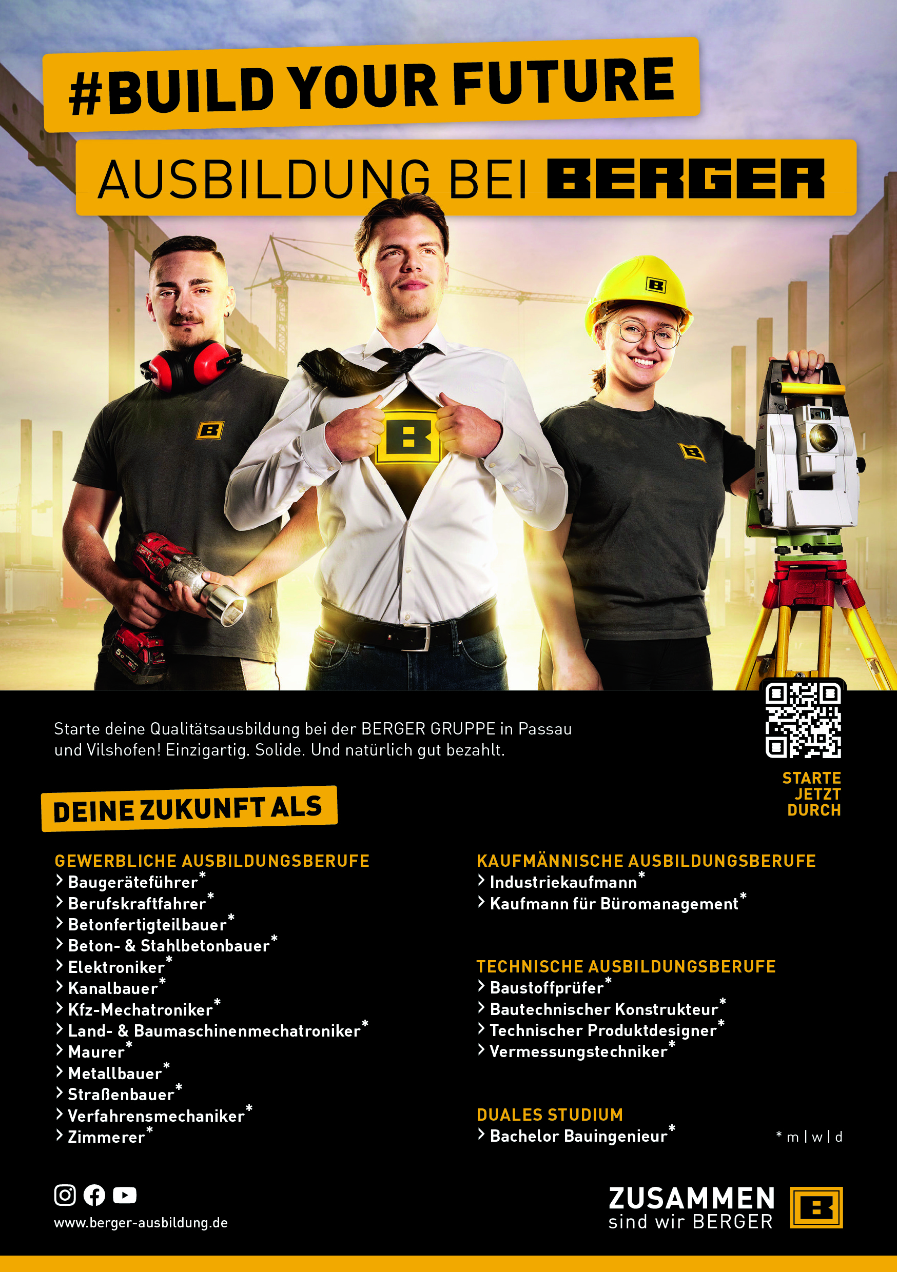 Ob im handwerklichen, im kaufmännischen oder im technischen Bereich: BERGER bietet Dir moderne Zukunft am Bau. Innovativ. Ohne auf traditionelle Werte zu verzichten.