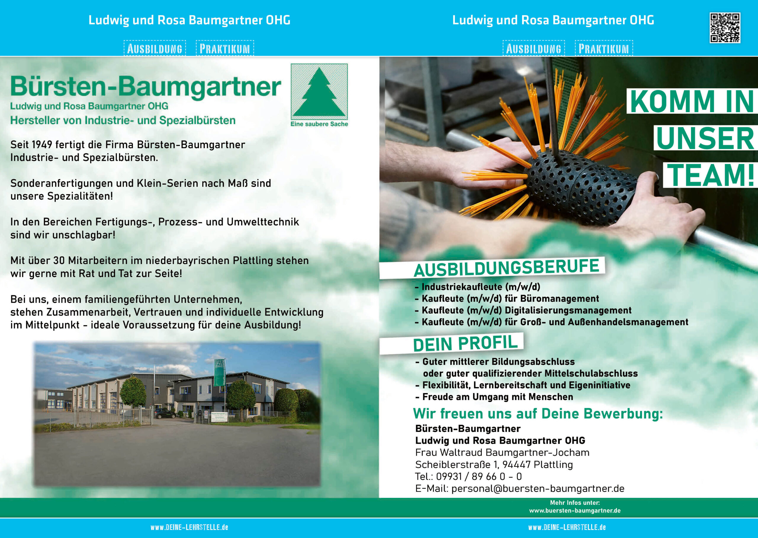Bürsten-Baumgartner ist Hersteller von Industrie- und Spezialbürsten. Werde Teil unseres starken Teams und begleite uns auf unserem kontinuierlichen Wachstumskurs. Bei Bürsten-Baumgartner erwartet Dich ein modernes Unternehmen, in dem Teamarbeit groß geschrieben wird. Wir heißen Dich herzlich willkommen als Industriekaufmann. Wir sind immer auf der Suche nach neuen Mitarbeitern, teilweise auch sehr kurzfristig, vor allem für die Bereiche Außendienst, Produktion, Versand und eventuell für allgemeine Bürotätigkeiten.