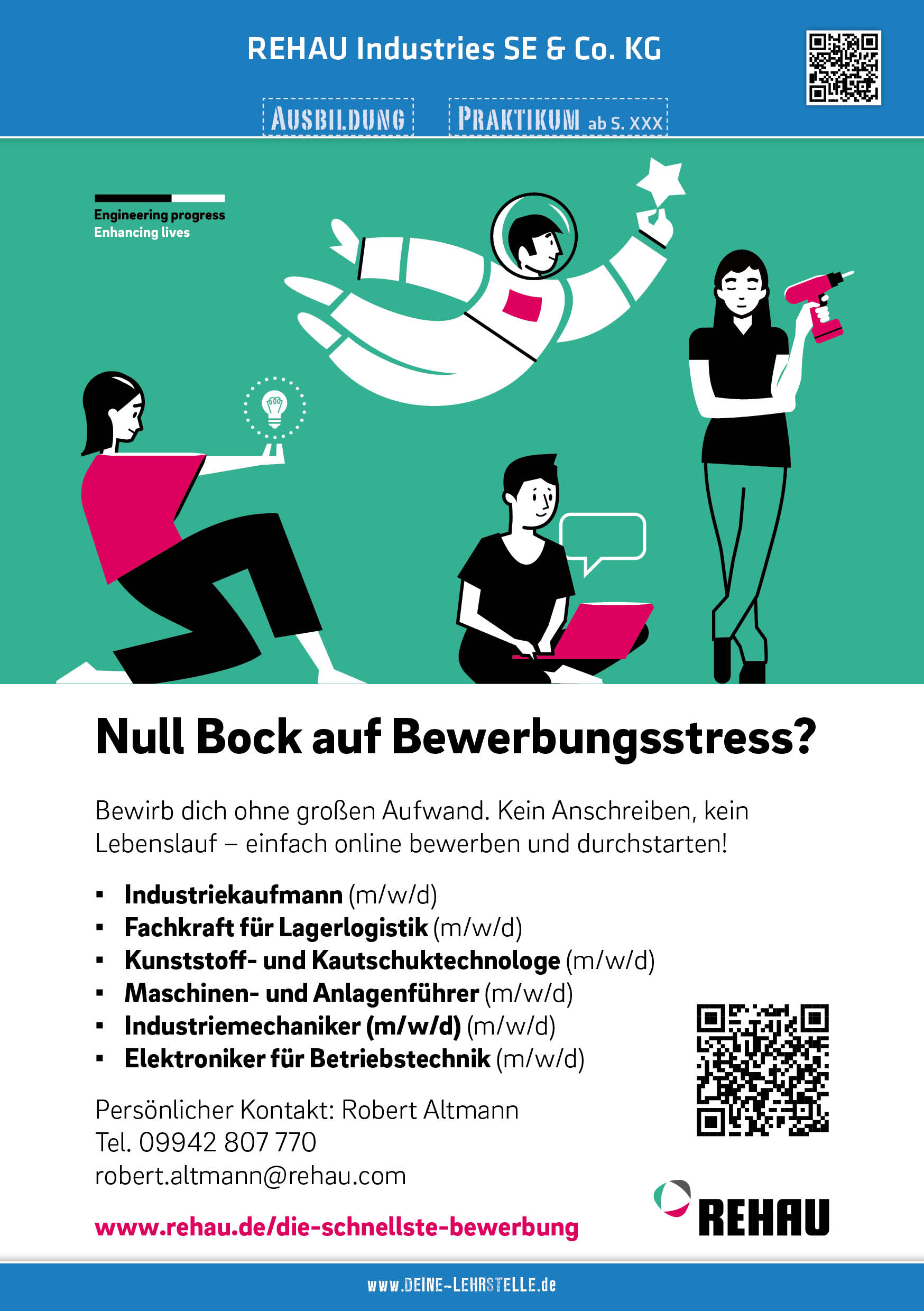 Besonderen Wert legt das Werk Viechtach auf die Ausbildung und Förderung junger Talente. Im eigenen Ausbildungszentrum werden aktuell Auszubildende in sechs technischen und kaufmännischen Berufen auf ihre berufliche Zukunft vorbereitet. Neben einer fundierten Fachausbildung erwarten die Azubis spannende Projekte, Teamevents sowie Trainings in Future Skills und vielfältige Weiterbildungsmöglichkeiten. Wer bei REHAU startet, profitiert von einem starken Team und Karrierechancen. Und das Beste: Die Bewerbung geht schneller als je zuvor – in weniger als zwei Minuten können Interessierte ihren ersten Schritt in eine erfolgreiche Zukunft machen: www.rehau.de/die-schnellste-bewerbung