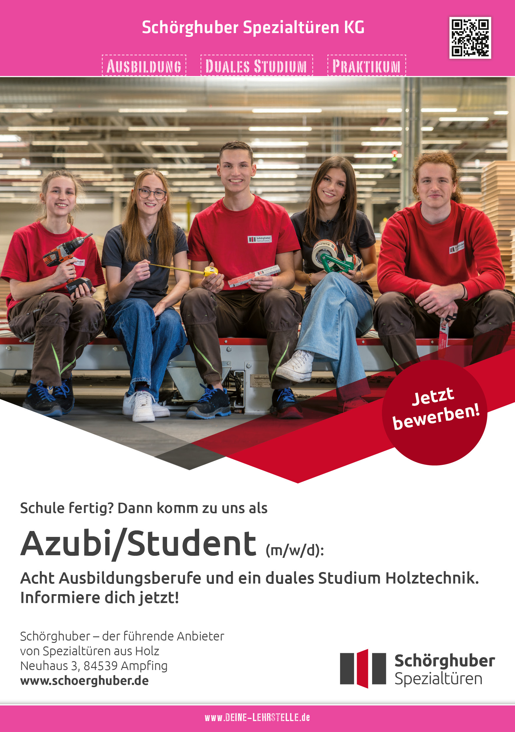 Als führender Hersteller von Spezialtüren setzt Schörghuber seit Jahren Maßstäbe in Qualität und Design. An unseren beiden Produktionsstandorten in Ampfing und Jahrdorf arbeiten über 450 Mitarbeiter, um Holztüren nach den neuesten und nachhaltigsten Standards zu entwickeln und zu produzieren. Lass uns gemeinsam ein Teil der Erfolgsgeschichte werden.