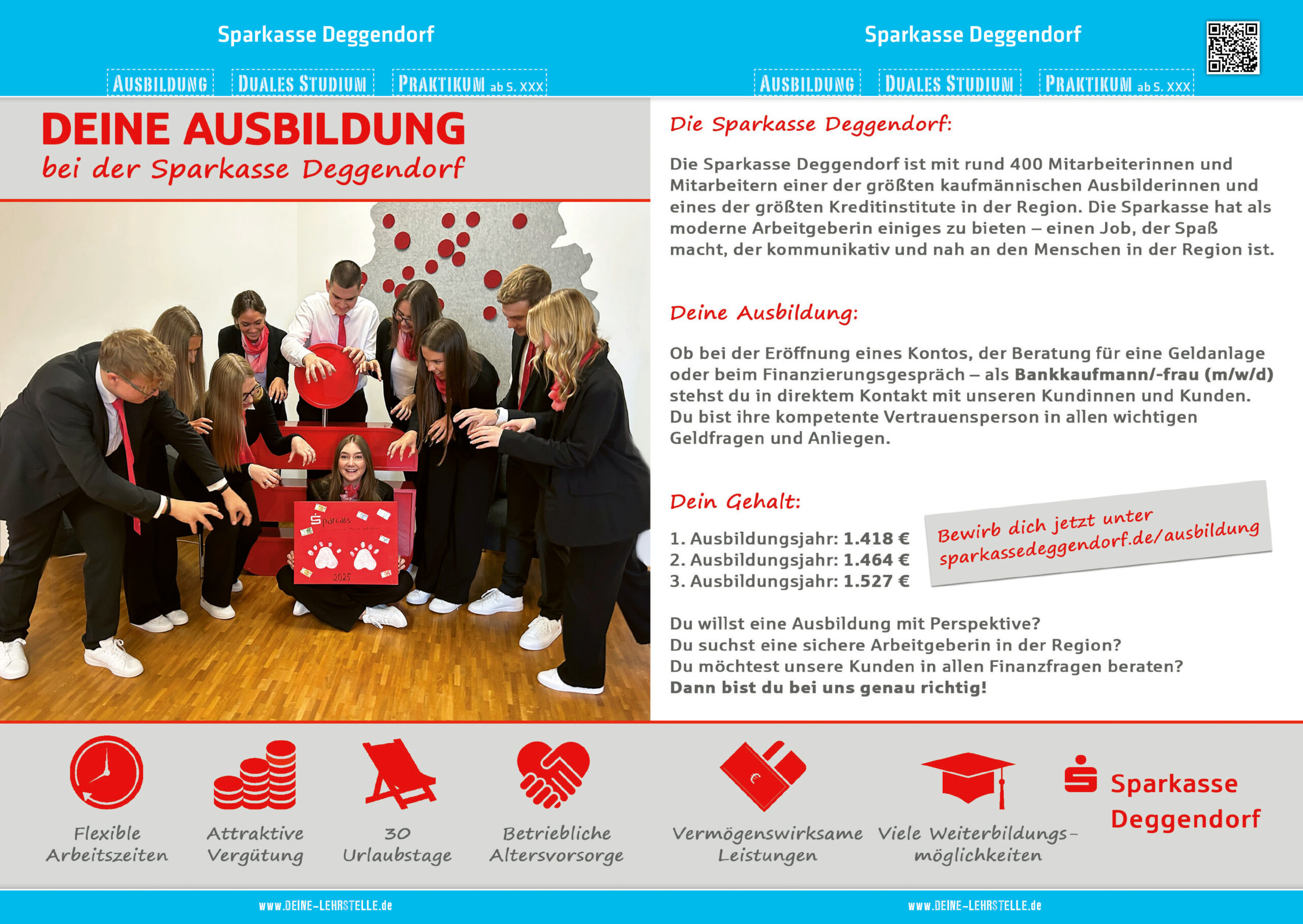 - Gute Karrierechancen: Wir glauben an die Entwicklung unserer Mitarbeiter und bieten dir nach deiner Ausbildung viele spannende Weiterentwicklungsmöglichkeiten. Deine Zukunft bei der Sparkasse Deggendorf sieht richtig gut aus!