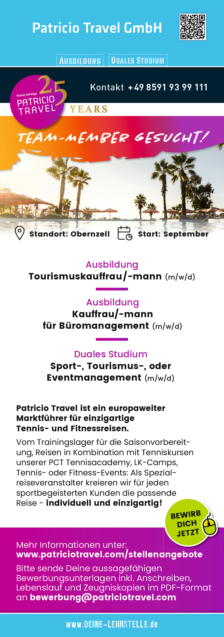 Als europaweit größter Reiseveranstalter für Tennis- und Fitnessreisen organisiert Patricio Travel Sportreisen nach Antalya, Kroatien, Kreta und Mallorca. Nationale und internationale Events und Turniere gehören zu unserer Kernkompetenz. Wir bieten eine spannende Ausbildung mit vielen tollen Möglichkeiten und einem bunten Mix aus Tennis, Fitness und Reisen. Klingt das nach dem perfekten Job für dich? Dann bewirb dich noch heute und werde Teil unseres Teams von sportverrückten Urlaubsmachern.
