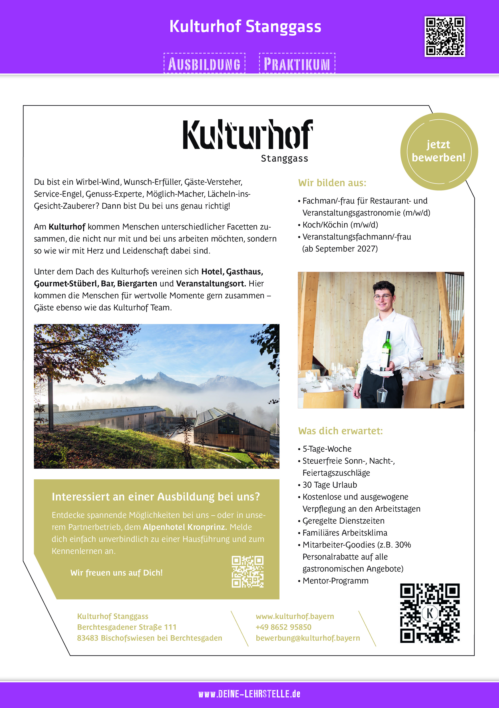 Der Kulturhof Stanggass liegt inmitten der schönen oberbayerischen Bergwelt zwischen Berchtesgaden und Bischofswiesen. Hier ist ein Ort der Begegnung mit einem wunderschönen Blick auf die spektakuläre Kulisse des Watzmann. Der Kulturhof vereint ein Hotel mit 34 Zimmern, ein modernes Gasthaus, einen Biergarten, das Gourmet-Restaurant „Solo Du“ mit einem Michelin-Stern sowie einen vielseitigen Veranstaltungsort für Seminare, Tagungen, Hochzeiten, Feiern und Kulturveranstaltungen.