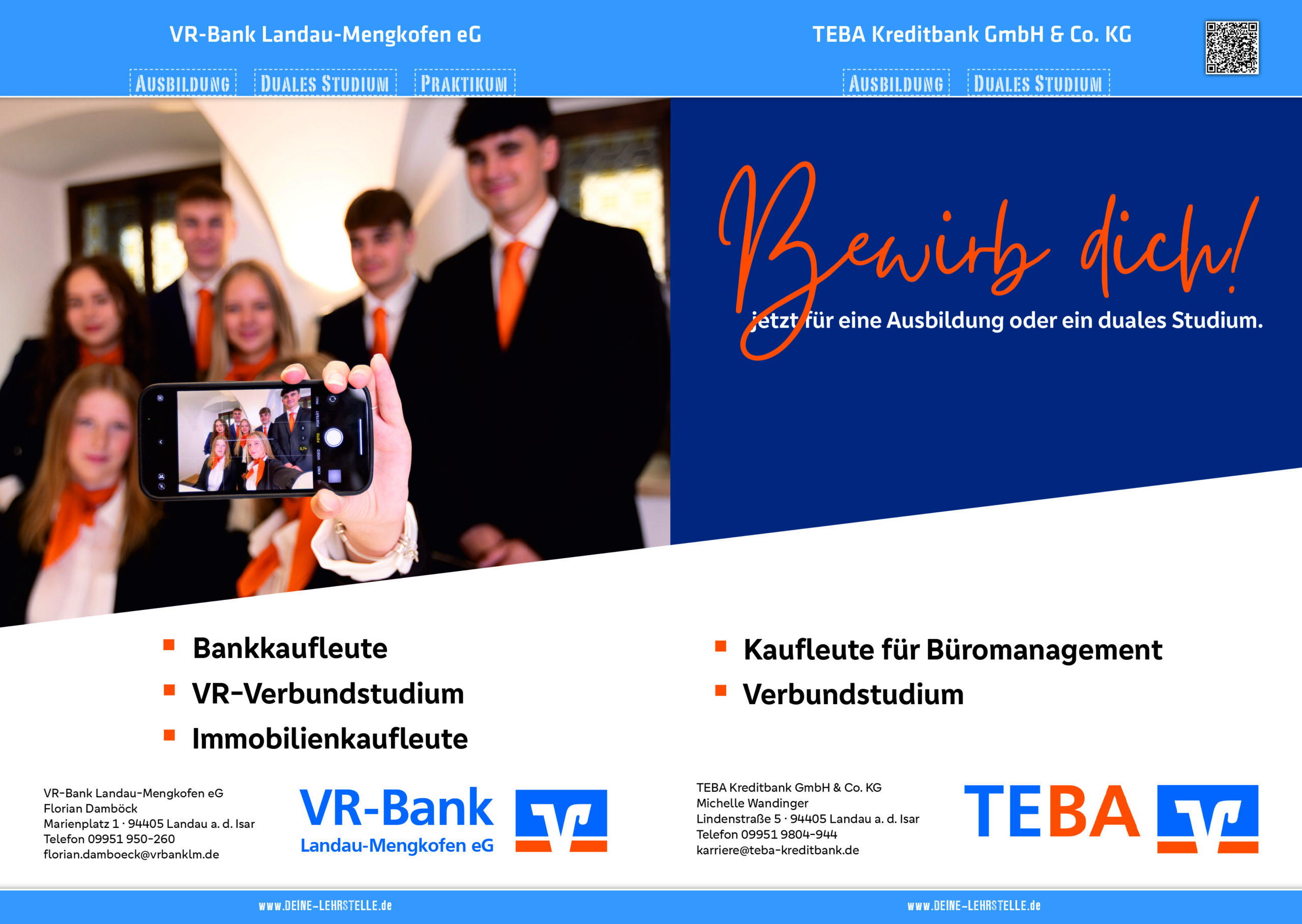 Eine Ausbildung bei der VR-Bank Landau-Mengkofen eG macht dich fit für einen Beruf mit Zukunft. Die Genossenschaftsbanken sind mit rund 8.000 Azubis der zweitgrößte Ausbilder im Beruf Bankkaufmann in Deutschland. Das theoretische Wissen wird dir in der Berufsschule vermittelt. Das fachliche Know-how erhältst du in unserer Bank. Wie viele andere Branchen verändert sich auch unsere aktuell rasant, und wir verändern uns mit. Zusätzlich zur klassischen Tätigkeit in der Geschäftsstelle entstehen durch die Digitalisierung viele neue Tätigkeitsfelder und Ausbildungsberufe im Bankgeschäft.